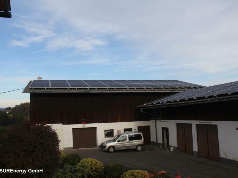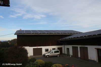 Sonnenstromanlage auf den landwirtschaftlichen Gebäuden der Familie Aichinger in Attendorf zusätzliche 9 kW - Sonnenstromanlage zur Abdeckung des Eigenstrombedarfs der Direktvermarktung von Josef Aichinger Geplanter Stromertrag: 21.000 kWh vollständig mit Bürgerbeteiligung finanziert 2014 |